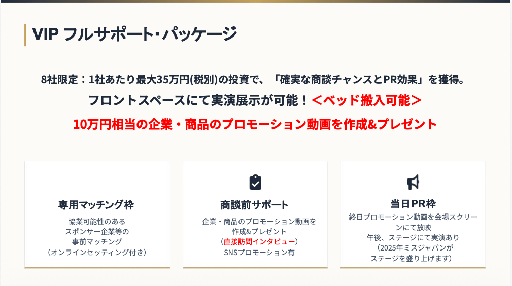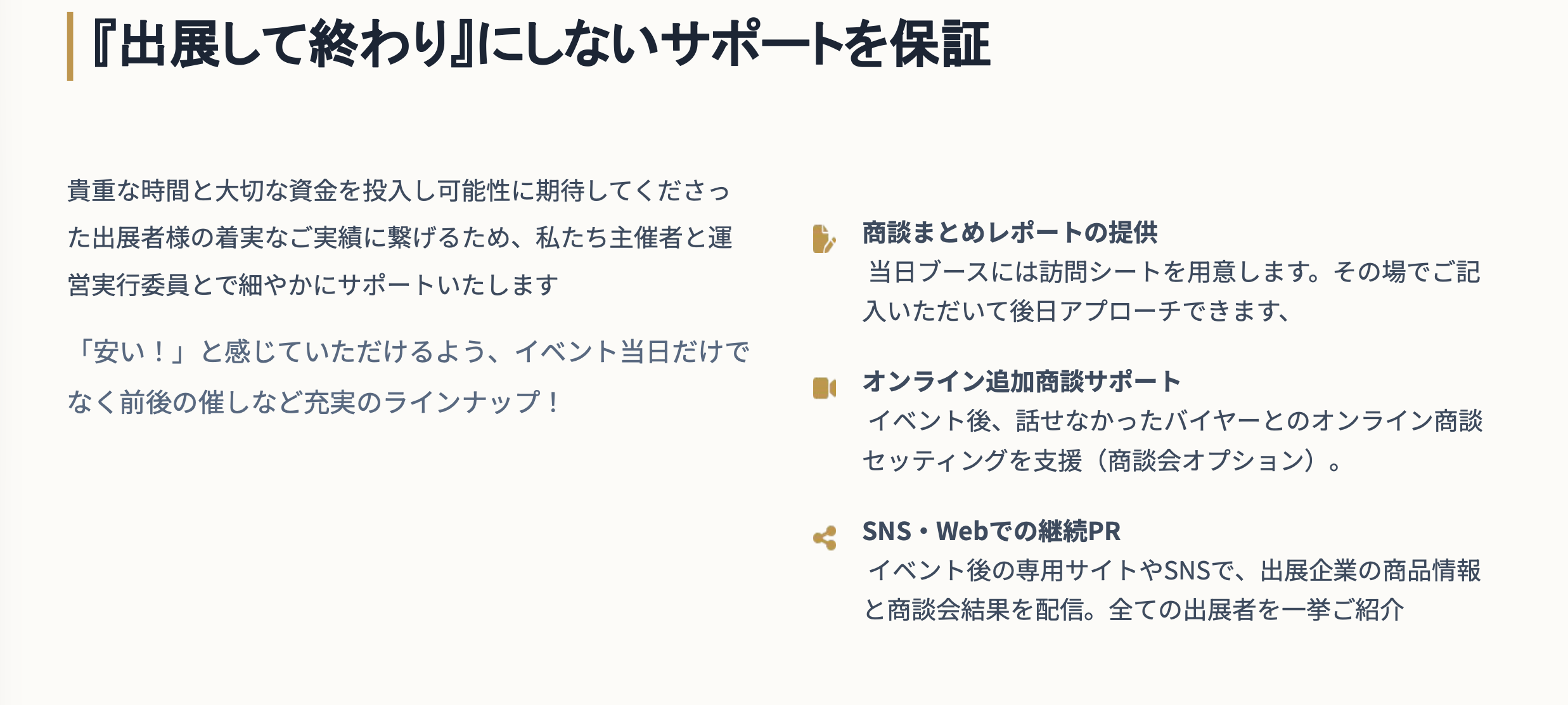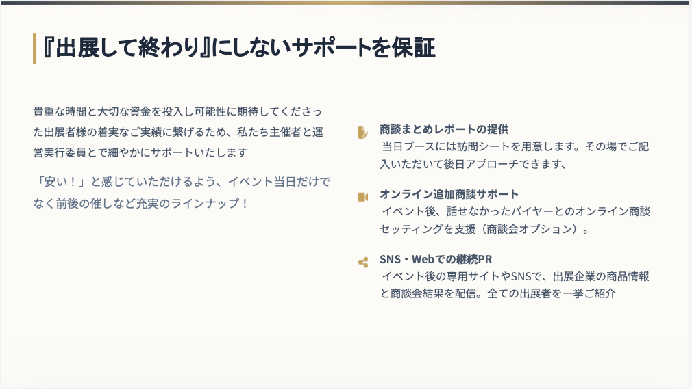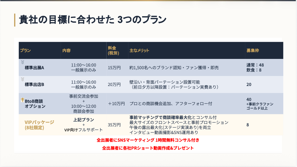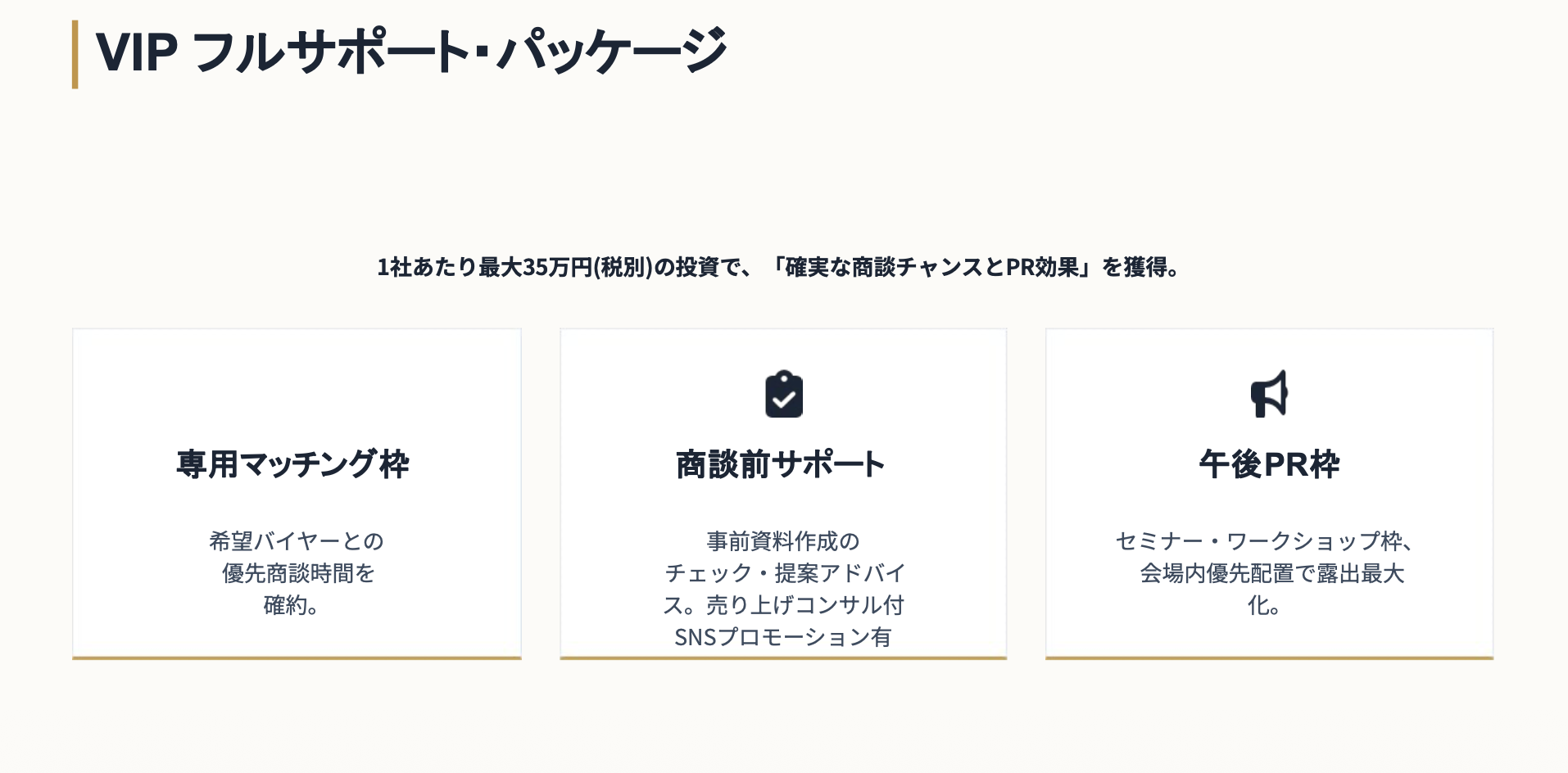 照準出展に加えて、プロとの商談機会追加、アフターフォロー付き。