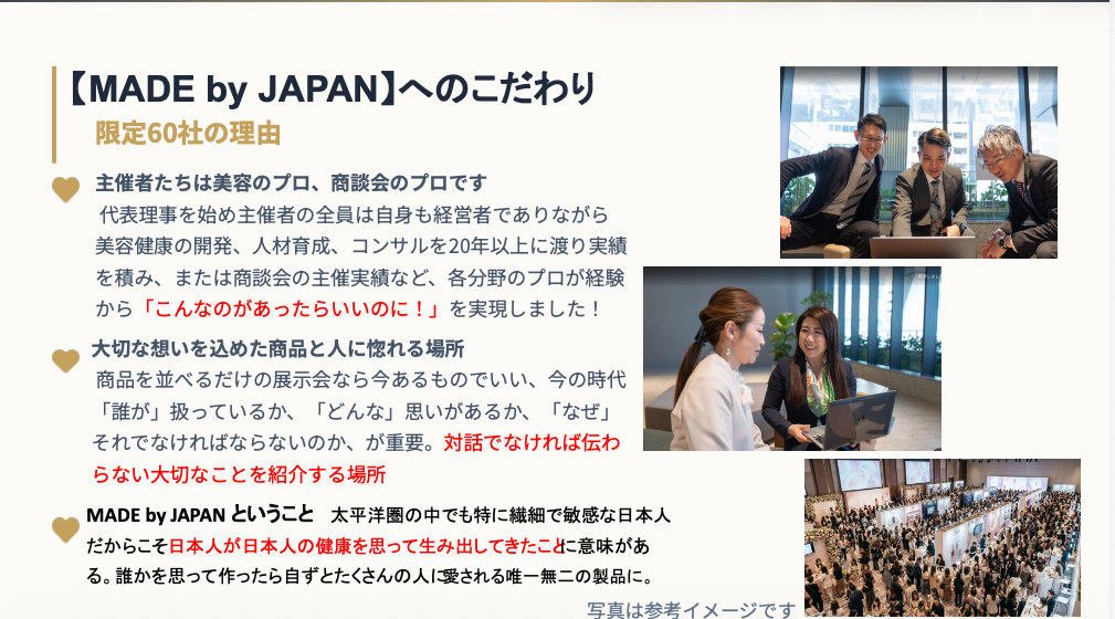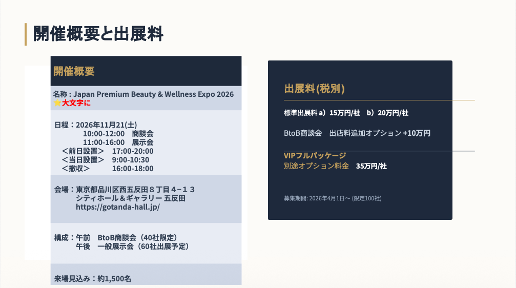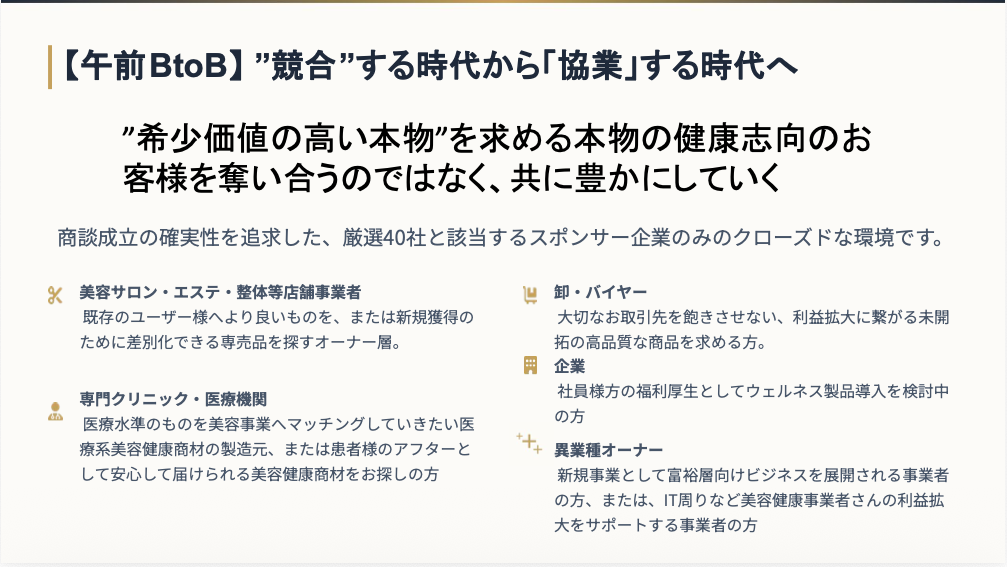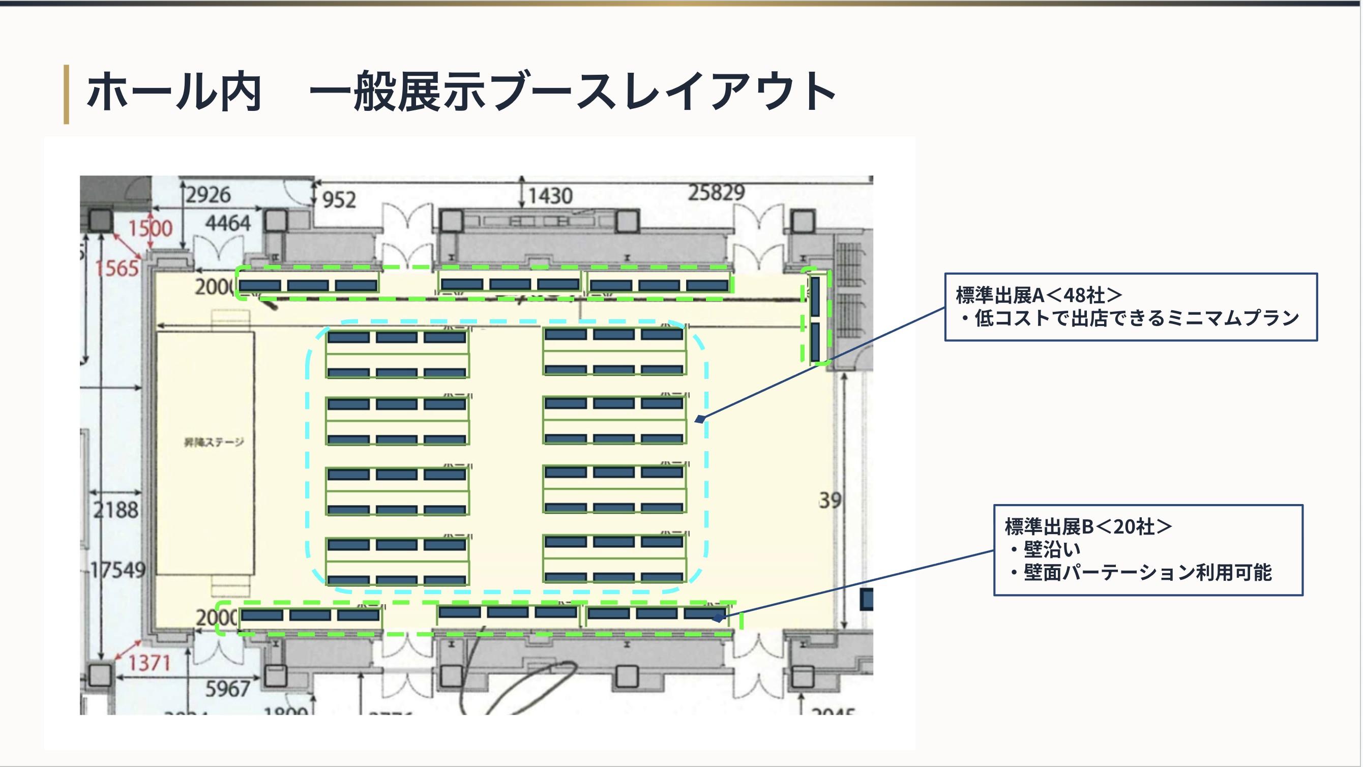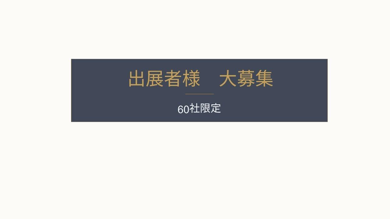 | 構成 | 午前 BtoB商談会(40社限定) 午後 ⼀般展⽰会(60社出展予定) |